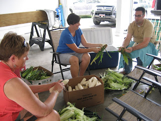 the corn is scraped off into pans and the ladies bag it to freeze! It's a daunting task but a lot of fun when we all pitch in. Plus my parents always host so I don't have to clean up the mess!!! (Thanks mom and dad!)